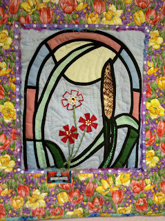 My quilt is about is about the closing of Borders Books and Music... am feeling a sense of loss of my favorite bookstore. The book label on the side is an actual borders rewards tag that invites the viewer to check out the Border's Reward card more closely. When placed with the barcode up, it depicts a ladder where one climbs into a world of wonderful books where one loses track of time . When placed with the rewards tab up, it now depicts a sense of loss as Borders Books no longer offers rewards and ceases to exist in time.