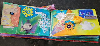 We each decided our theme and size of art and made book pages for each other. I picked Positive Vibes as my theme and chose a 4x6 size so I could also incorporate some of my postcard and ATC swaps in my project. Created a book with watercolor papers, paint, and many embellishments. When I receive my Cnandian partner's page, I will add it and finish the book. I love how its turning out!